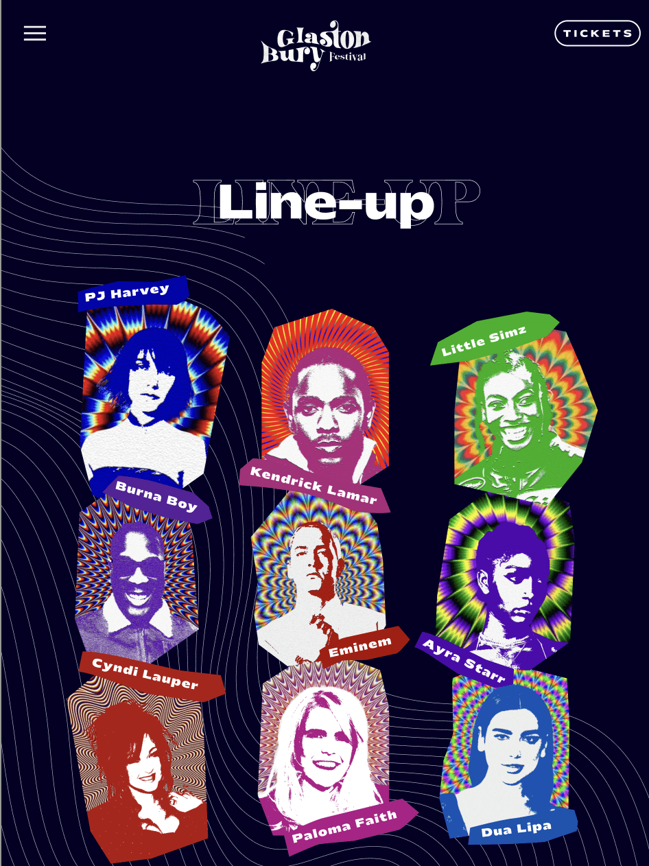 Il était important de préserver les couleurs vives de l'identité originale tout en y apportant de la fraicheur, pour créer un univers visuel à la fois vivant, excentrique et rassembleur, à l'image de l'esprit familial et humoristique qui caractérise le festival.L'enjeu était de capturer l'esprit libre et créatif de Glastonbury tout en assurant une lisibilité optimale sur tous les supports.
