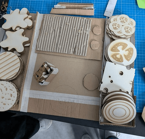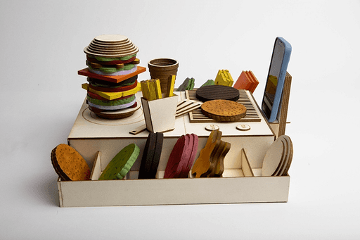 Le concept de Mary's Burger repose sur un jeu de cuisine où les enfants doivent reconstituer des burgers en empilant des pièces physiques correspondant aux commandes affichées sur l'application mobile. Chaque élément du burger (pain, steak, salade, fromage, tomate) possède une forme, une épaisseur et une couleur spécifiques qui permettent à l'intelligence artificielle de reconnaître quelle pièce l'enfant manipule.