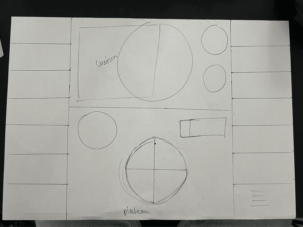 La phase de conception a débuté par une réflexion sur l'ergonomie et l'inclusivité du jeu. Nous avons réalisé de nombreuses maquettes et prototypes en papier puis en carton, en nous mettant à la place des enfants pour tester différentes configurations. Une attention particulière a été portée à l'accessibilité : le jeu devait être utilisable aussi bien par les droitiers que par les gauchers, avec une disposition des éléments pensée pour faciliter la manipulation.